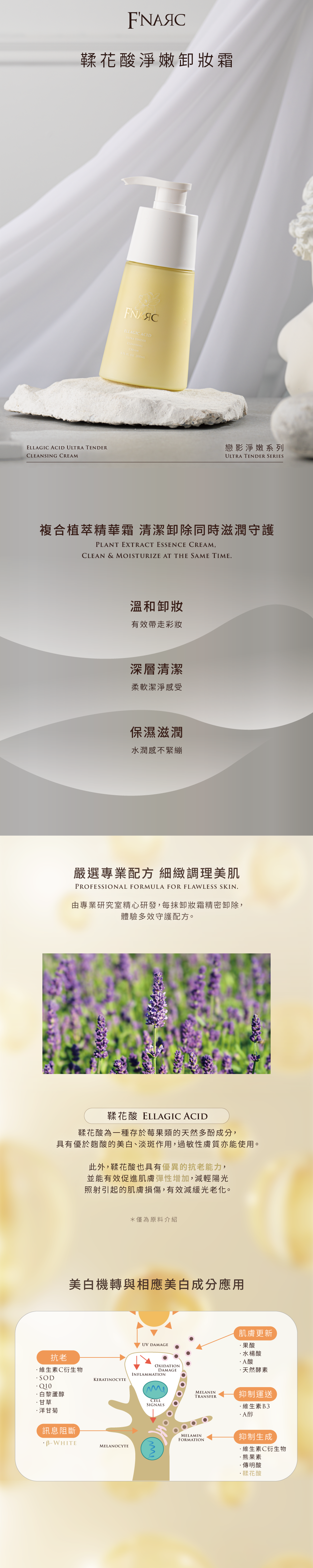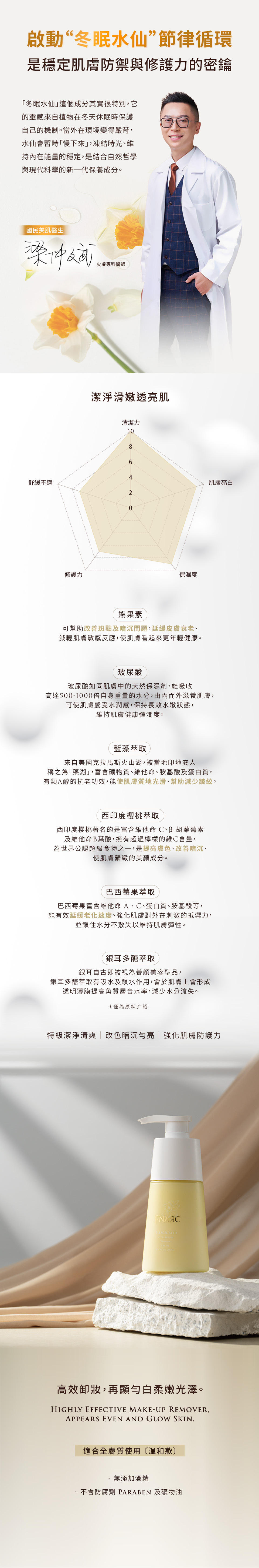 蘊含天然鞣花酸,協助潔淨同時維持肌膚明亮,並結合熊果素、玻尿酸、藍藻與西印度櫻桃萃取等,可卸除彩妝與毛孔髒污,改善黯沉粗糙,潔後水潤不緊繃。卸妝保養同步完成,呈現輕透柔嫩的潔淨美肌。