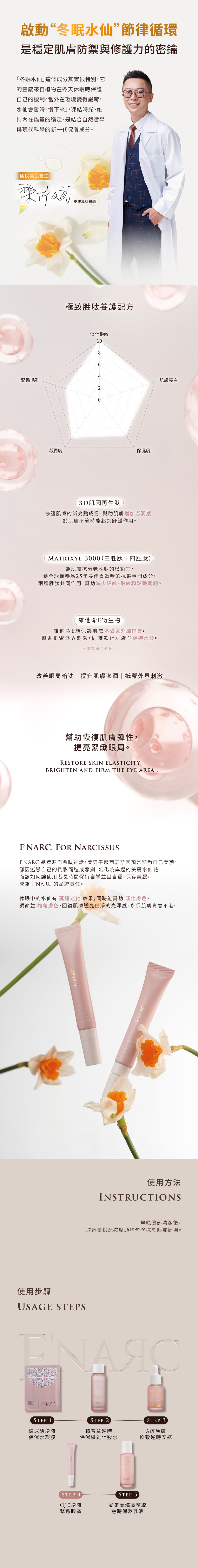 以輔酶Q10為核心,搭配Matrixyl™ 3000與3D肌因再生肽,有效啟動肌膚修護機制,提升肌膚緊緻,改善眼周鬆弛與細紋。Q10具優異抗氧力,可減緩環境壓力造成的老化跡象;Matrixyl™ 3000促進彈力重建,3D肌因再生肽則強化屏障修護,舒緩脆弱眼周。質地溫和、保濕鎖水,持續使用能淡化暗沉,恢復眼周緊緻光采。
